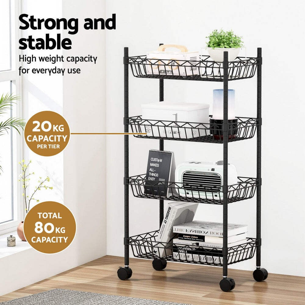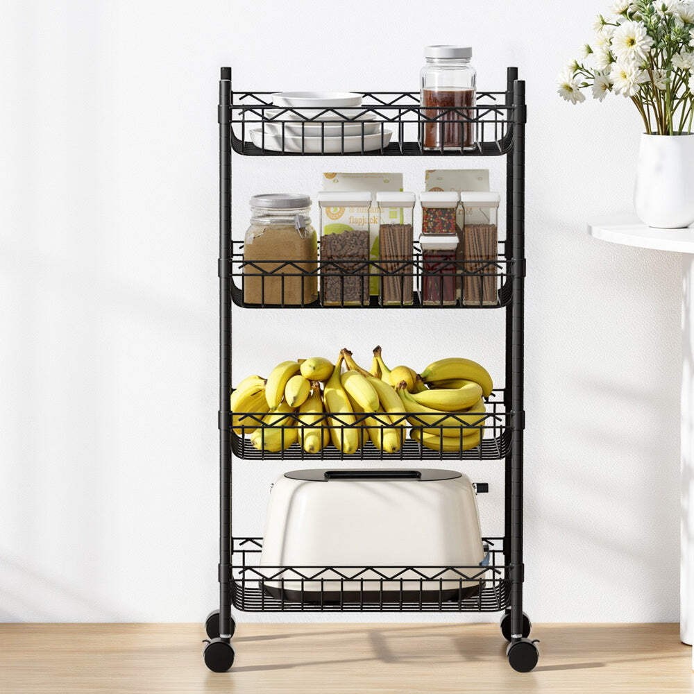 The Artiss 4-Tier Shelving Unit offers a durable and versatile storage solution for any space. Constructed with a reinforced steel frame and finished with rust-resistant powder coating, it supports up to 20kg per shelf, making it ideal for kitchens, garages, or home organisation. The adjustable shelves with V-shaped mesh surfaces allow you to customise storage heights while keeping items secure. Equipped with smooth-rolling, lockable wheels, this shelving unit is easy to move and position as needed. Quick to assemble and low maintenance, it's the perfect compact storage cart to keep your space tidy and organised.